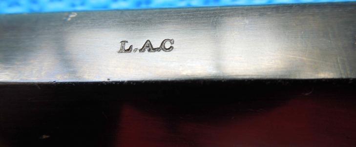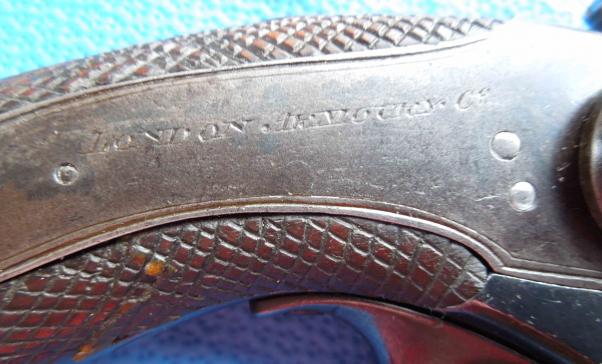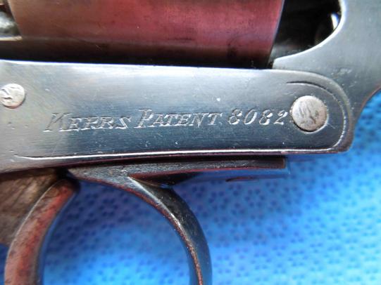 Details include “L.A.C.” and “a crown over a ‘V’” and “crown over ‘GP’” proof marks and the Lower right side of frame exhibits the engraved “KERR’S PATENT No. 8082” and the same number appears engraved on the cylinder with proof marks. On lower left frame to rear is stamped “LONDON ARMORY”. London Armory company is engraved on the lock This number (8082) is sometimes confused and considered the patent number but it is actually the serial number and is different on every revolver. This serial number is within the range that was exported to the United States in the American Civil War.